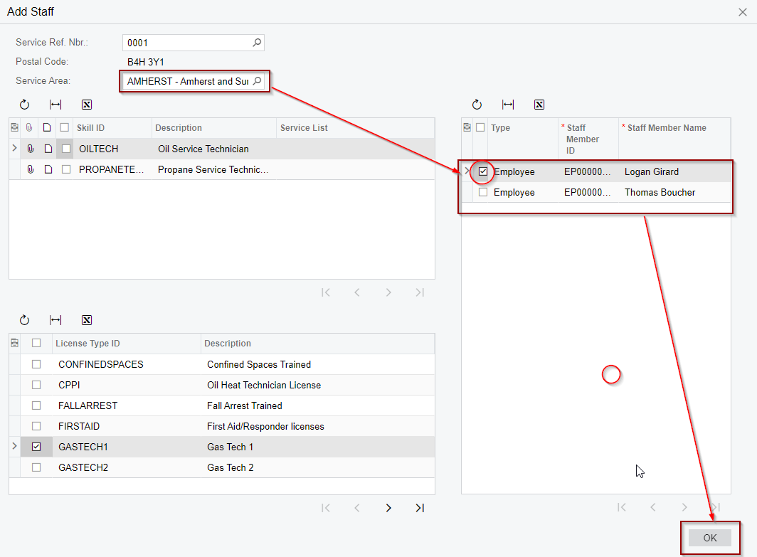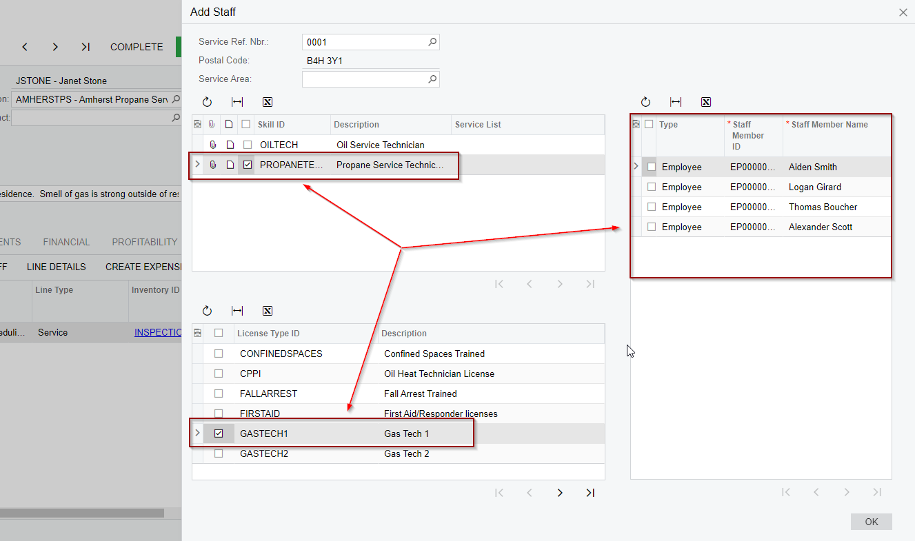 2. The Add Staff screen displays skills and licenses on the left and available employees on the right to choose from. In the example I need a Propane Tech>Gas Tech 1 to inspect the residence first and identify any gas leaks.