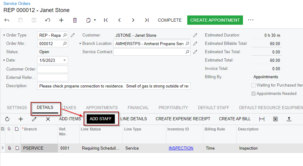 1. Once the Service Order has been created and Saved, on the DETAILS tab, select ADD STAFF