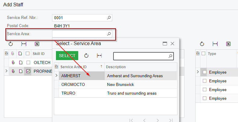 3. Because I know which Branch Location the customer resides in, I will now select the Service Area that correlates to their location