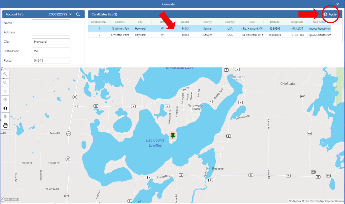 3. Seleccione las coordenadas disponibles de la Lista de candidatos o Geocodifique manualmente colocando un marcador en un mapa... haga clic en Aplicar para guardar
