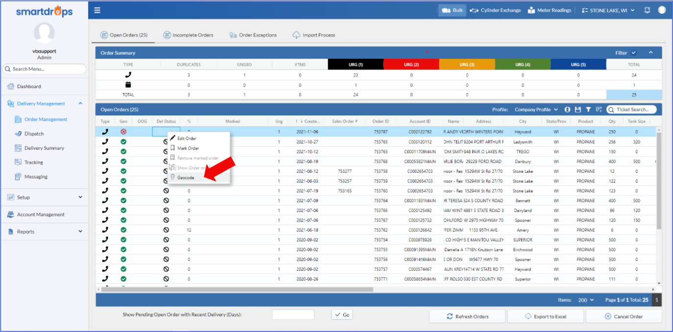 1. Seleccione un pedido no geocodificado en la cuadrícula de